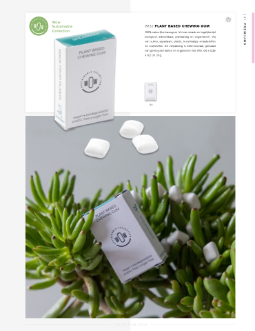 100% natuurlijke kauwgom. Vol van smaak en tegelijkertijd biologisch afbreekbaar, plantaardig en veganistisch. Vrij van suiker, aspartaam, plastic, kunstmatige smaakstoffen en zoetstoffen. De verpakking is CO2-neutraal, gemaakt van gerecycled karton en organische inkt. Afm. 0,6 x 0,35 x 0,2 cm. 13 g.